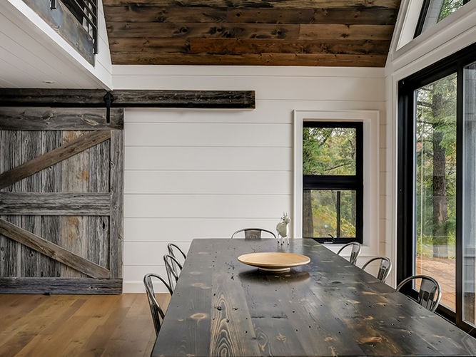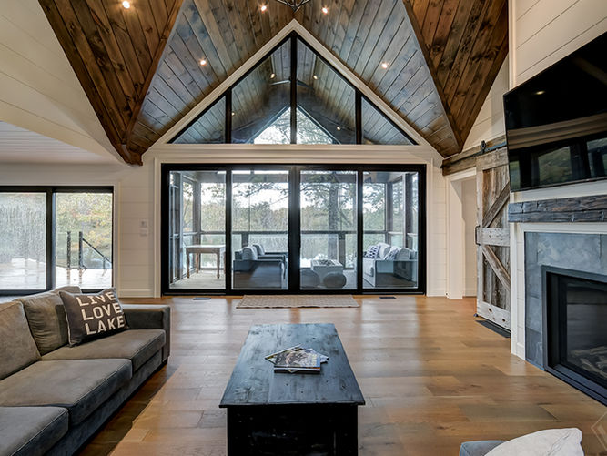 This large four-season cottage makes an excellent space for a big family. Its features include a huge entertainment kitchen and living space, curbless master shower, grand Muskoka room, and rustic barn doors throughout. The interior has both modern and traditional elements that together create a contemporary vibe with classic charm. Oversized windows provide great views from anywhere in the cottage.