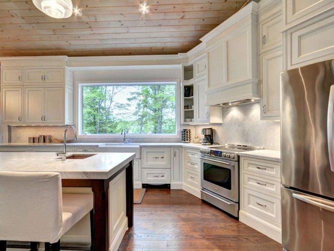 This 3,300-square-foot traditional design was building partnership with Traditional Muskoka Homes. It incorporates many architectural features beloved to historic Muskoka, including a sizeable lakeside porch, wide-plank wood flooring, and Cape Code siding. Excellence in craftsmanship is evident in the extensive detailed trim work inside and out.