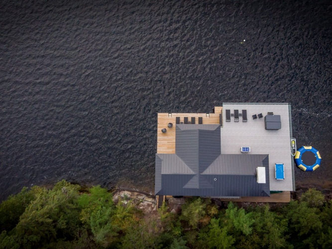 Located on beautiful Lake Rosseau, this extraordinary boathouse-cum-guesthouse was designed to bridge the gap between function and style. Large windows provide modern appeal and uninterrupted lake views, while the use of clear cedar in the boat storage area strikes a note of classic Muskoka charm. A covered lounge with serving bar and exterior stone fireplace make for the perfect gathering spot. Other special features of this project include a standing seam metal roof, upper-level stand-off glass railings, and fully automated electrical and A/V.