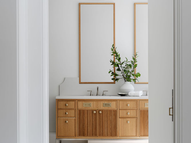 In this Mirror Lake Port Carling cottage, no detail has been left unattended. Characterized by exquisite style and high-end finishes, it embraces rich colour palettes indoors and out, features striking architectural elements, and combines the best of traditional aesthetics with modern convenience and luxury. The exterior is characterized by its unique roofline, which includes awnings, a curved portico, and flat-roofed dormers, as well as mullion windows and cedar-shake accents. Inside the 2,700-square-foot cottage, a deep, earth-toned palette complements classic design elements, including a towering stone fireplace, exposed beams, and shiplap walls. A huge Muskoka room with heated floor overlooks the lake.