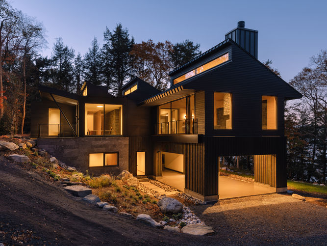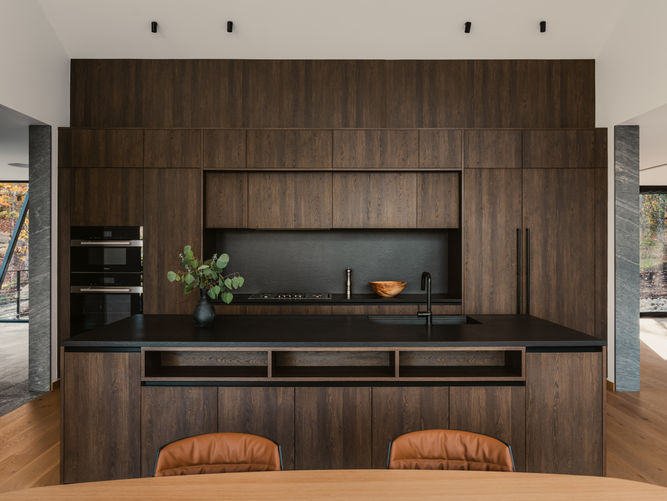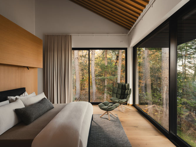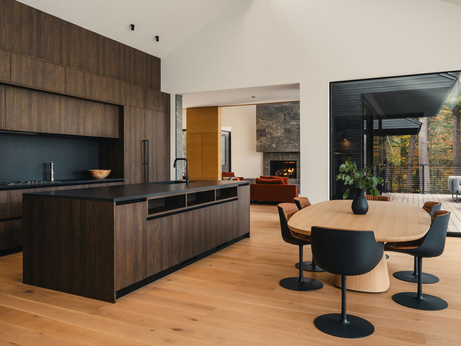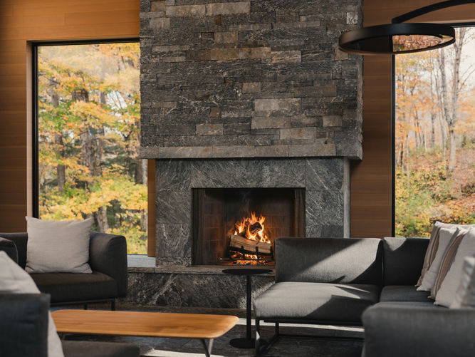 Set within a forested landscape, this contemporary retreat frames the surrounding woods with expansive glazing and warm, architectural detailing. The interiors balance natural materials with refined geometry. Soaring ceilings, stone fireplaces, and tailored millwork create a natural pattern of texture and light. Each space is designed to feel anchored to the landscape, while maintaining a calm, modern composure. Thoughtful transitions between living, dining, and wellness areas support a lifestyle centered on comfort, openness, and a seamless connection with nature.