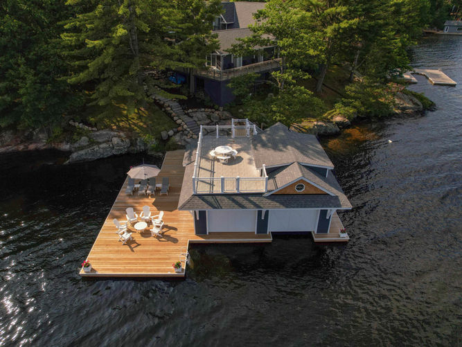 Follow a winding pathway of rough-cut granite flagstone down to the water’s edge and this stunning boathouse on Walker’s Point, Lake Muskoka. With 1,000 square feet plus one wet and one dry boat slip, the contemporary-classic take on the iconic Muskoka boathouse offers everything for entertaining or just relaxing by the water, day or night. A sheltered living area with roll-up walls makes a great spot to enjoy the breezes while staying out of the sun, while a rooftop deck with glass railings provides space for sun worshippers or stargazers. Eliminate the need to traipse up to the cottage with a decked-out kitchen space and bar.